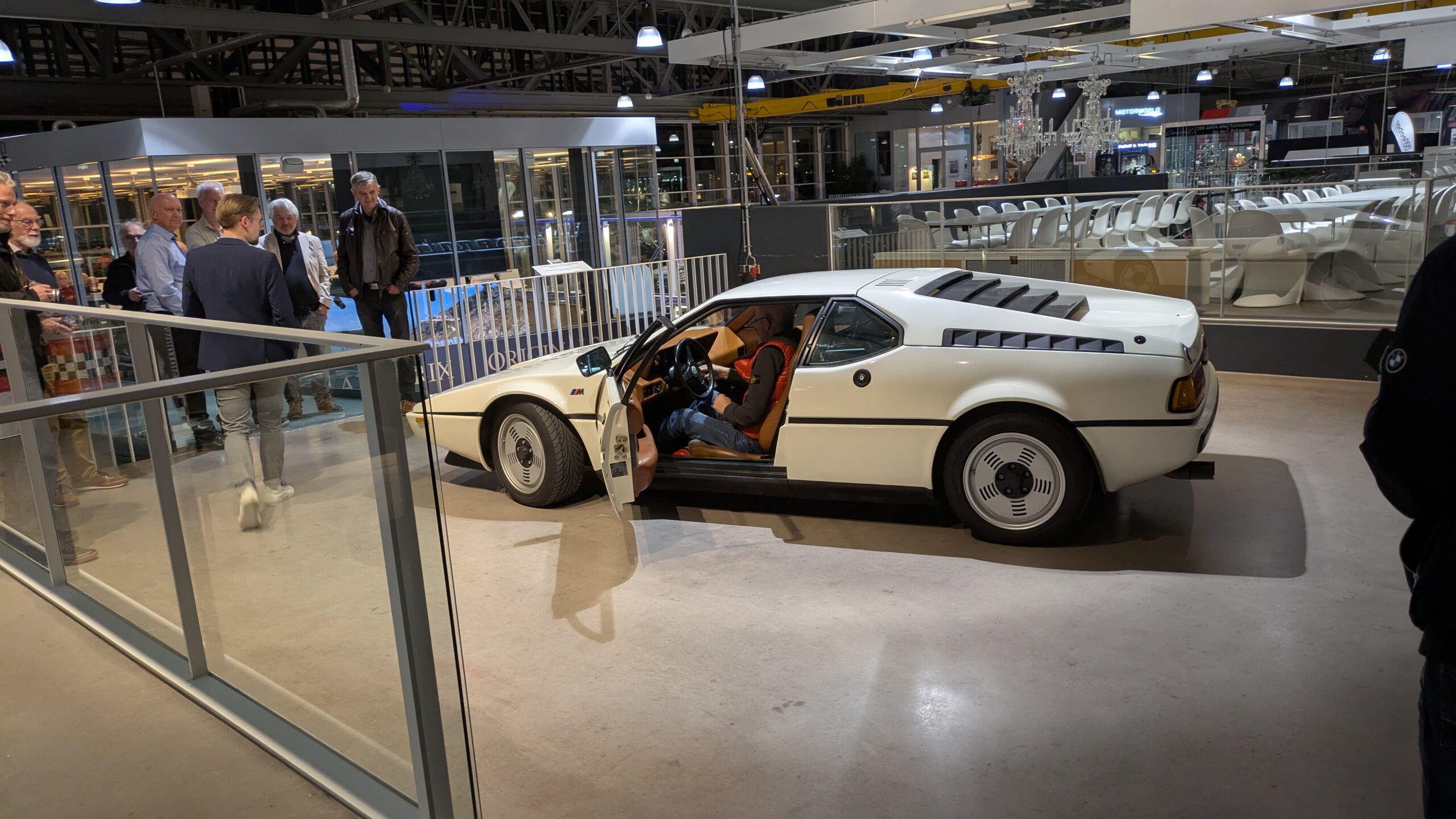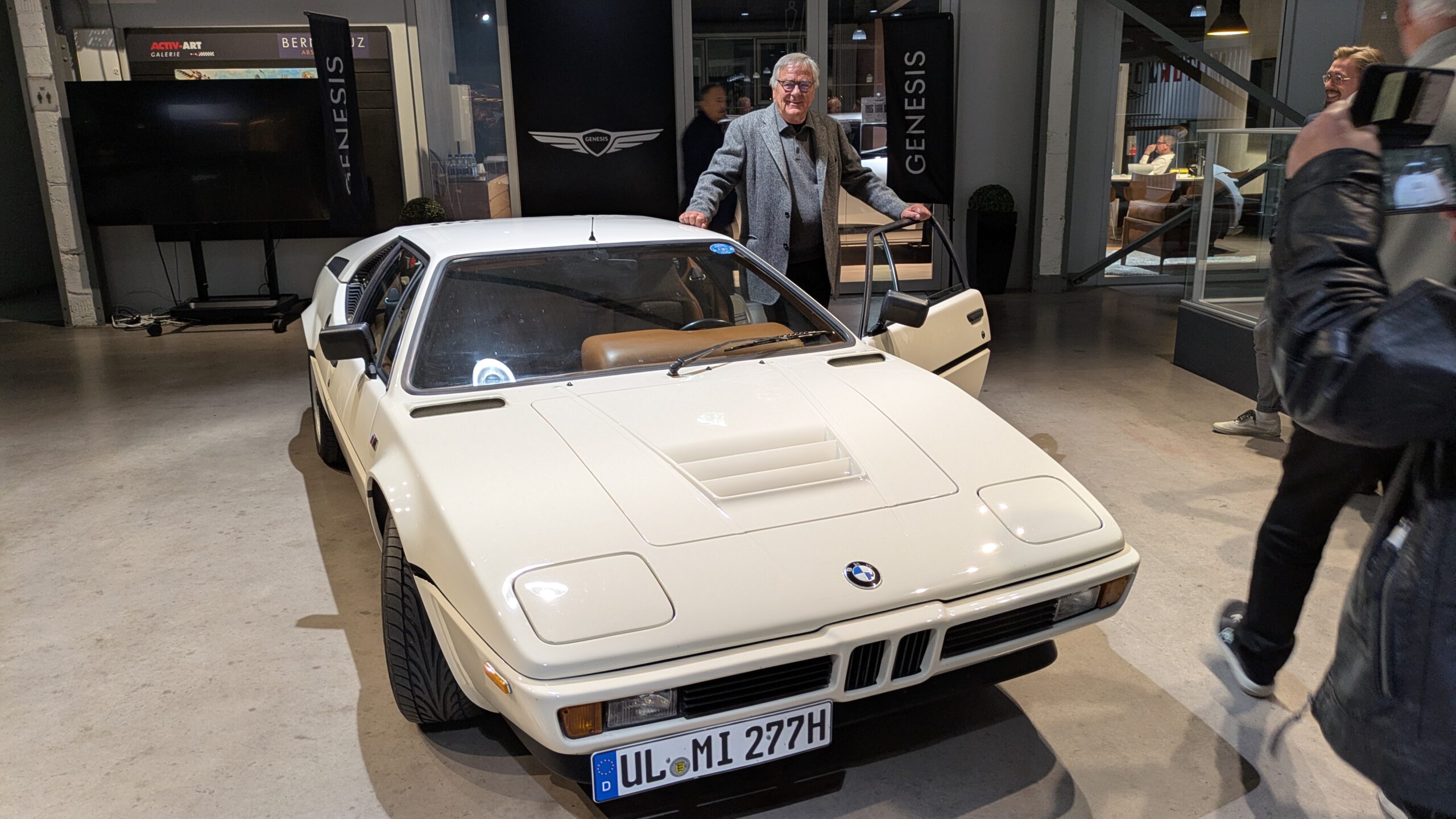 Und es zeigte sich einmal wieder, dass man immer belohnt wird, wenn man (s)einer Leidenschaft nachgeht und neugierig bleibt. Die an diesem Abend stau-bedingt besonders herausfordernde Anfahrt und der damit verbundene Feierabendstress fiel in der Sekunde komplett von einem ab, als man die beeindruckende, mit herrlichen Oldtimern bestückte ‚Werkstatthalle‘ aus Glas der MOTORWORLD betrat, die beiden umwerfenden, spontan herbei-gesteuerten BMW M1 erblickte (großer Dank an dieser Stelle an die beiden M1-Fahrer) und die vielen bekannten Gesichter aus der Welt des historischen Motorsports erkannte und begrüßte. Zur großen Freude aller Anwesenden war auch einer der Gründer des SOLITUDE-REVIVAL e.V., Rennfahrer-Legende Hans Herrmann, der im Februar seinen 98. Geburtstag feiert, in die MOTORWORLD gekommen, um mit Jochen Neerpasch in Erinnerungen zu schwelgen.
