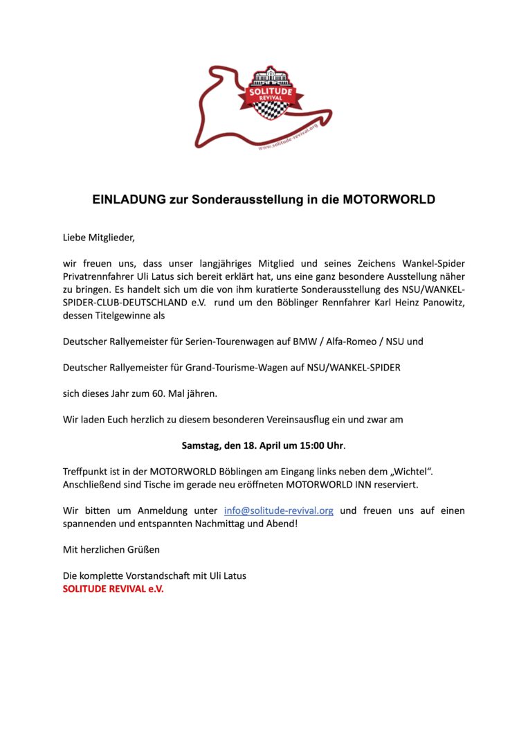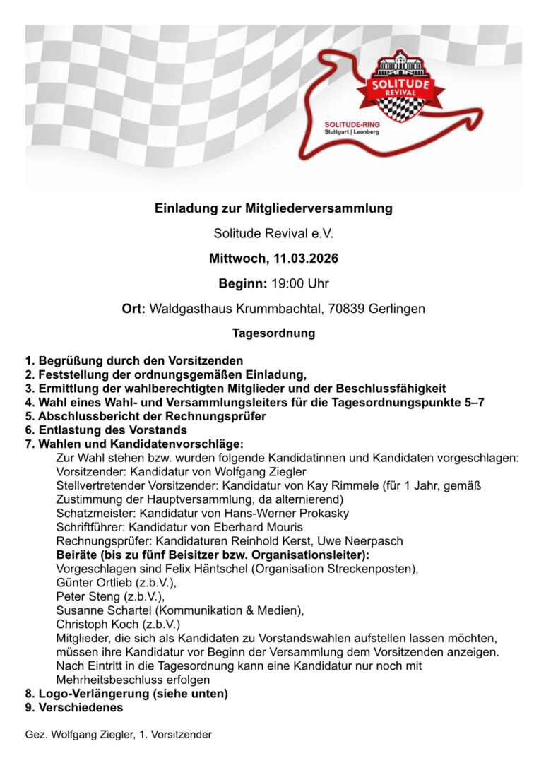 Herzlich eingeladen sind alle Mitglieder, Unterstützer und Freunde des Solitude-Revival e.V. – wir freuen uns auf anregende Gespräche, neue Gesichter und einen geselligen Abend in entspannter Atmosphäre.